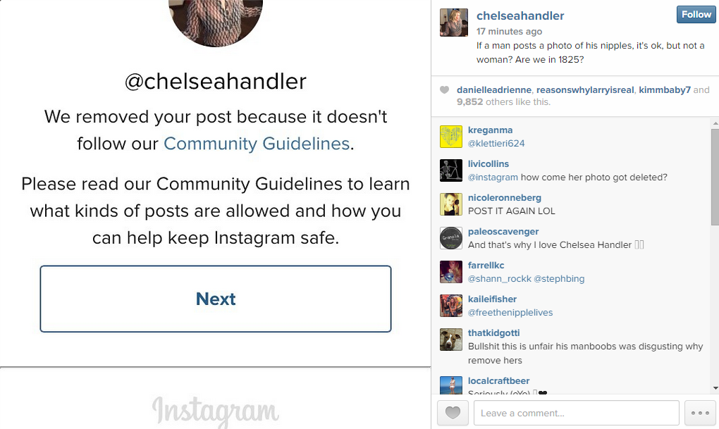 The photo was then deleted a third time. Now, some people have been saying that Instagram’s overt, if not flat out aggressive, refusal to allow an adult, successful, woman to show her boobs was obvious. I, perhaps naively, am genuinely confused about the intensity of Instagram’s policy enforcement. Chelsea Handler is a competent and intelligent entertainer, who unabashedly has a reputation for adult, sometimes even-gasp-vulgar humor, and has never marketed herself to an underage audience. She made a conscious choice to share her own body with her followers who, once again, CHOOSE to view her photos. A part of her body which, if she had been a man, would have been 10000% fine to share.